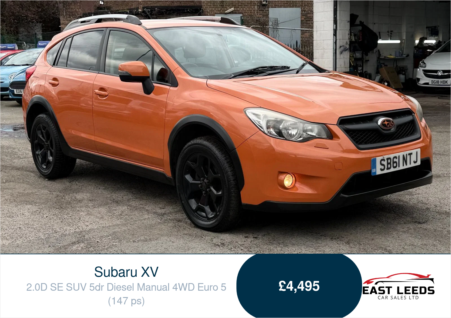 Full Service History + Just Been Serviced & New Clutch Fit. MOT Until 29/03/2027. 6 Months Warranty, Comes Fit with Detachable Tow Bar, 17" Alloy Wheels, Sony Touch Screen Media System with Bluetooth Hands Free, Car Play, Reversing Camera, Duel Electronic Climate Control, Cruise Control, 4 x Electric Windows, Folding Wing Mirrors. This Car Has Been Very Well Looked After. πβ¨ Discover the thrill of driving the Subaru XV 2.0D SE SUV 5dr Diesel Manual 4WD in stunning Tangerine Orange, available now at East Leeds Car Sales! π This eye-catching vehicle isnβt just about looks; it boasts a full service history and has just been serviced, so itβs ready for your next adventure. With a new clutch fitted, you can count on a smooth ride! π Enjoy peace of mind with an MOT until 29/03/2027 and a 6-month warranty! π This SUV is packed with features: a detachable tow bar for all your hauling needs, 17" alloy wheels for that stylish edge, and a Sony touchscreen media system with Bluetooth hands-free and CarPlay for seamless connectivity. π±πΆ Experience ultimate comfort with dual electronic climate control, cruise control for those long drives, and 4 electric windows plus folding wing mirrors for convenience. π₯³ This Subaru XV has been exceptionally cared for, making it a fantastic choice for anyone seeking a reliable, fun, and practical vehicle. Donβt miss out on driving away in this fantastic SUV in Leeds! Visit East Leeds Car Sales today and elevate your driving experience! ποΈπ
